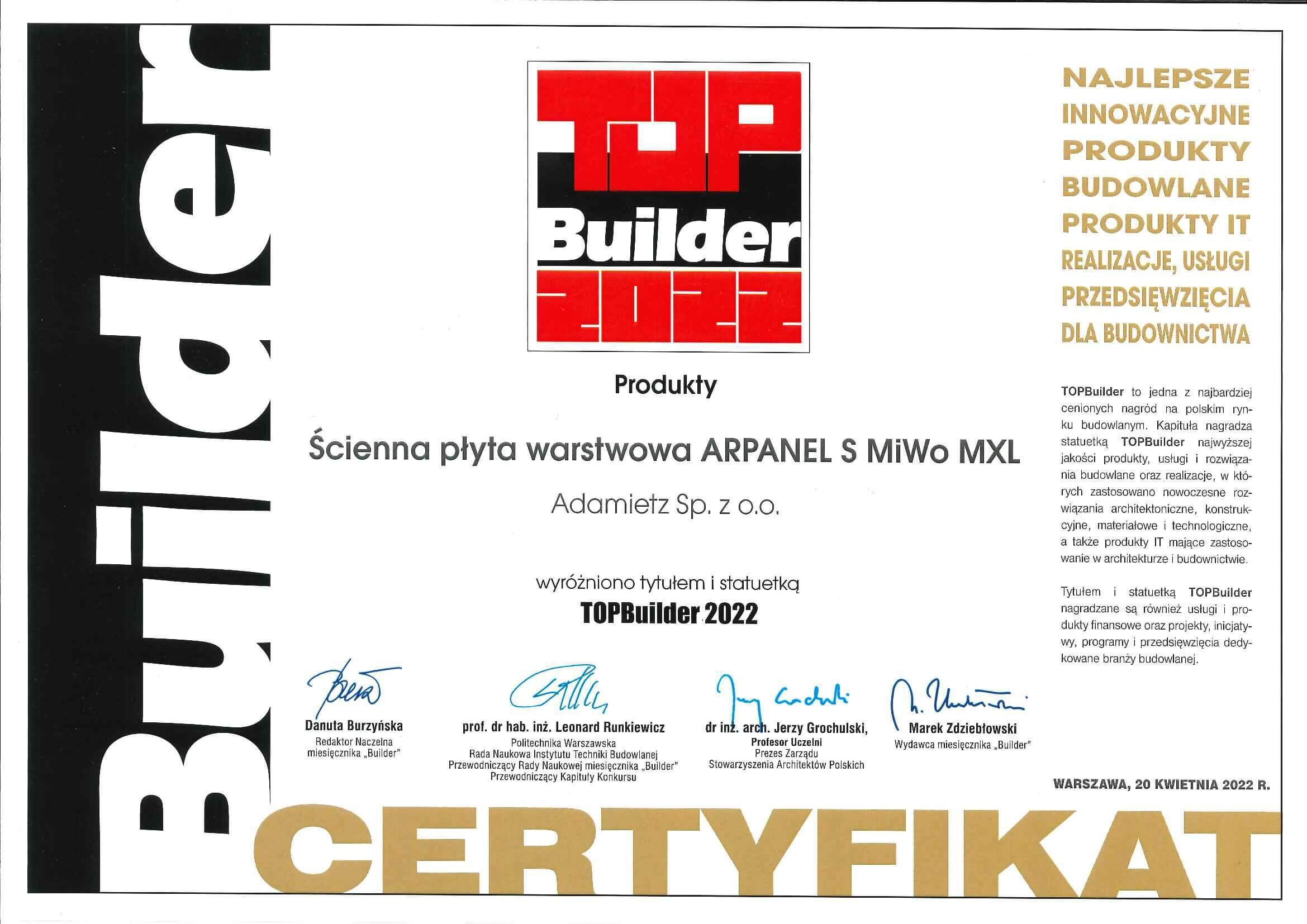 Během 14. ročníku celostátní soutěže jsme získali titul a sošku TopBuilder 2022 za výrobek ARPANEL S MiWo MXL jako inovaci na trhu a jedinečnou kvalitu.💪🏅
